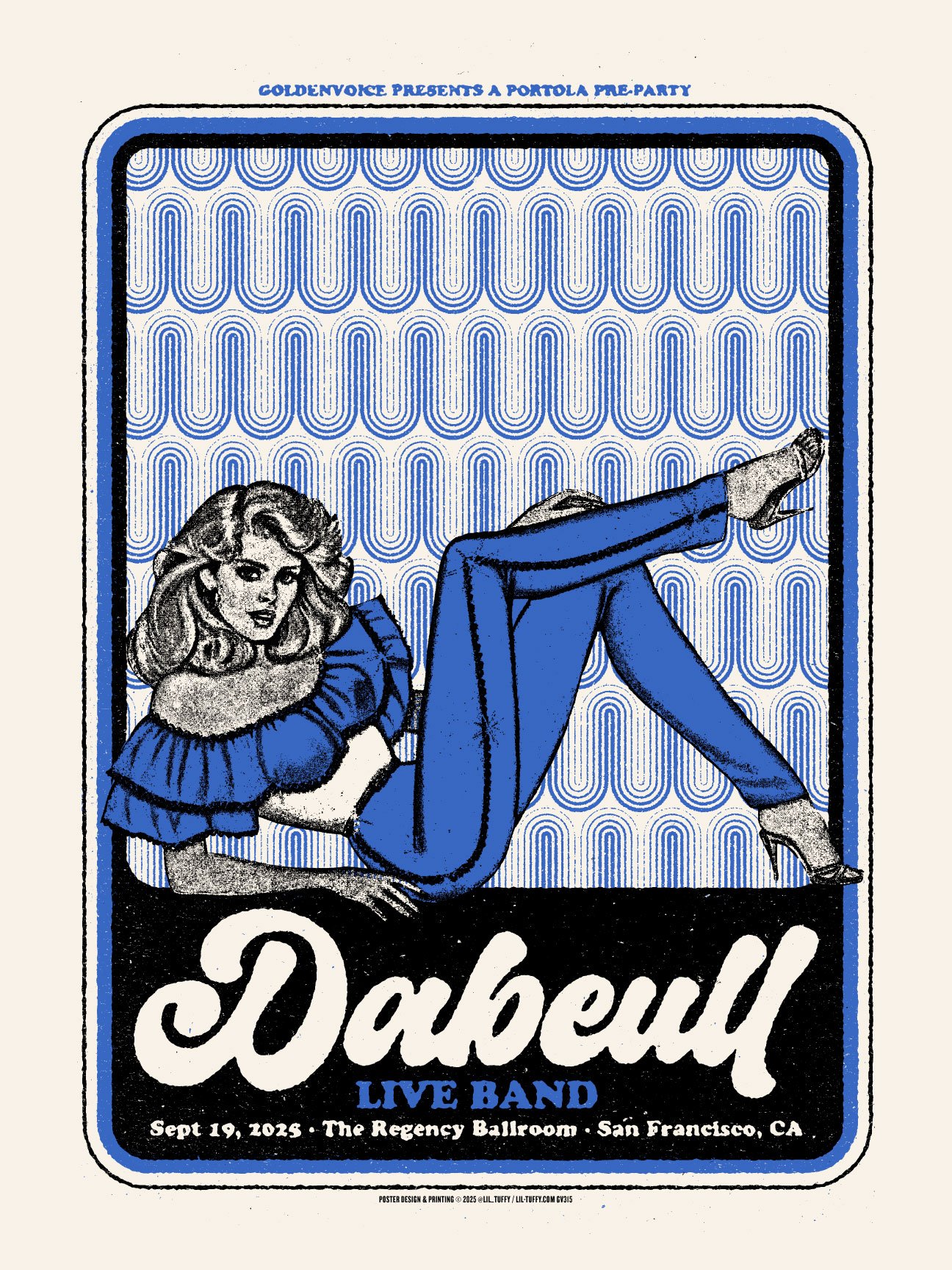 Dabeull (live band - Portola Pre-Party) The Regency Ballroom · Sep 19. 2025 · San Francisco Client: Goldenvoice Dimensions: 18" x 24" · Edition: 200 · Colors: 2